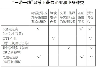 伴隨“一帶一路”戰(zhàn)略的推進(jìn),中國企業(yè)走出去“菜單”將從鐵路、核電、建材等領(lǐng)域延伸至特高壓、4G、云計算等領(lǐng)域。能源、交通、物流、資金通道的建設(shè)都離不開安全通暢的信息網(wǎng)絡(luò)通道的支撐。推動國家之間鐵路、公路、航空、電信、電網(wǎng)、能源管道的互聯(lián)互通,發(fā)展相互之間的資金、物流、信息流以及人文合作交流,實現(xiàn)信息的互聯(lián)互通,才是推進(jìn)絲綢之路經(jīng)濟(jì)帶建設(shè)的基礎(chǔ)。“一帶一路”催生的經(jīng)濟(jì)發(fā)展必定會推動運(yùn)營商國際業(yè)務(wù)的增長,“走出去”的企業(yè)對于網(wǎng)絡(luò)、數(shù)據(jù)中心、機(jī)房和云計算的需求會快速增加,運(yùn)營商的國際業(yè)務(wù)收入會隨著“一帶一路”的發(fā)展取得一定規(guī)模的增長。IDC和云計算與“一帶一路”計劃密切相關(guān),國內(nèi)大范圍的橫跨東西的信息化需要數(shù)據(jù)中心的支持。與沿線國家的信息交流需要跨境的IDC中心或云計算資源。“一帶一路”政策下獲益企業(yè)和業(yè)務(wù)種類見下表。