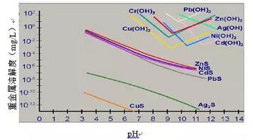 下圖是幾種可以通過堿性pH穩(wěn)定化的重金屬的氫氧化物沉淀與硫化物沉淀的溶解度隨pH值變化趨勢的對比,請注意縱坐標(biāo)是對數(shù)坐標(biāo),即每一小格就是一個數(shù)量級。
