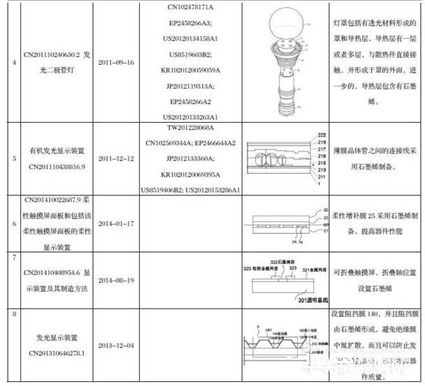 2)改進(jìn)型:以專利2-8為代表,在原有結(jié)構(gòu)上增設(shè)一石墨烯材料層(3,4,6,7,8),由于石墨烯的透明、導(dǎo)電、導(dǎo)熱等一系列優(yōu)點(diǎn),增設(shè)之后可以彌補(bǔ)不足,從而取得了顯著的技術(shù)效果;或者直接以石墨烯材料替原有的材料(專利5),從而取得顯著的技術(shù)效果。以改進(jìn)型專利居多,這類專利技術(shù)難度相對(duì)較低,國(guó)內(nèi)企業(yè)在該類型專利申請(qǐng)的實(shí)力不弱于國(guó)外公司,而且長(zhǎng)期代工,技術(shù)人員積累了大量的相關(guān)經(jīng)驗(yàn),更容易結(jié)合新材料的特性,提出改進(jìn)的技術(shù)方案。