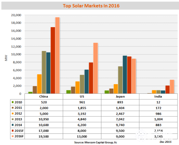 Mercom Capital表示,2015年,全球太陽能光伏安裝量約為57.8吉瓦,預(yù)計到2016年底,這一數(shù)據(jù)將增至64.7吉瓦,其中,中國領(lǐng)跑全球太陽能光伏安裝容量,約19.5吉瓦。