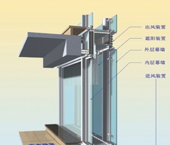 雙層動(dòng)態(tài)節(jié)能幕墻(也叫熱通道幕墻)按通風(fēng)原理分為自然通風(fēng)和強(qiáng)制通風(fēng)兩種系統(tǒng)。由外層幕墻,內(nèi)層幕墻、遮陽裝置,進(jìn)風(fēng)裝置、出風(fēng)裝置組成。其設(shè)計(jì)理念是實(shí)現(xiàn)節(jié)能、環(huán)保,使室內(nèi)生活工作環(huán)境與室外自然環(huán)境達(dá)到融和。