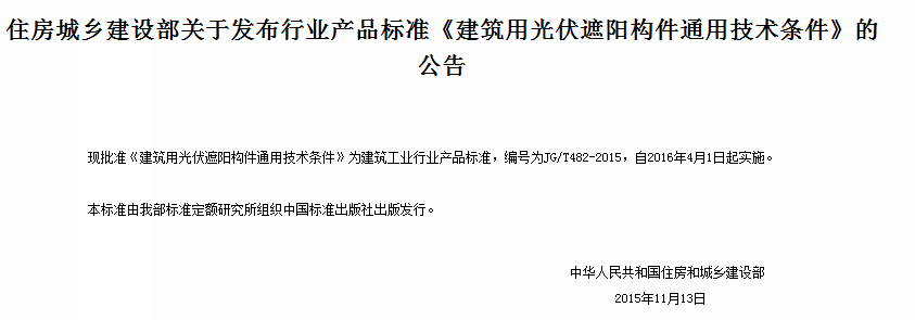 日前,記者從國住房和城鄉(xiāng)建設(shè)部官網(wǎng)獲悉,國住房和城鄉(xiāng)建設(shè)部已批準(zhǔn)《建筑用光伏遮陽構(gòu)件通用技術(shù)條件》為建筑工業(yè)行業(yè)產(chǎn)品標(biāo)準(zhǔn),編號為JG/T482-2015,自2016年4月1日起實(shí)施。