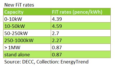 英國(guó)政府于12月17日拍板定案,未來(lái)一年度的太陽(yáng)能FIT(Feed-in Tariffs,躉購(gòu))補(bǔ)貼價(jià)格基準(zhǔn)將調(diào)降到4.39pence/kWh,總補(bǔ)貼上限為1.5億英鎊。整體而言,英國(guó)FIT調(diào)降64%的幅度略低于原先預(yù)期的87%。