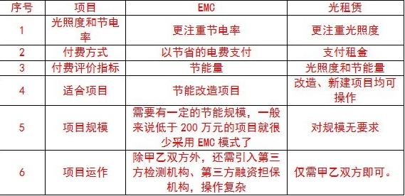 EMC一般需要體量較大的節(jié)能改造項(xiàng)目才能實(shí)施。對亮燈率和節(jié)電量有一定的規(guī)模要求,換句話說EMC是為大型企業(yè)錦上添花,但對小微企業(yè)的節(jié)能改造沒有任何幫助。光租賃在改造、新建項(xiàng)目均適合,且對亮燈率及節(jié)電量規(guī)模沒有任何要求,對任何大中小型企業(yè)均適合;