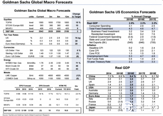 不過,每桶20美元只是一種偏悲觀的預(yù)測(cè),高盛的基準(zhǔn)預(yù)測(cè)還沒有這么低,其預(yù)計(jì)明年油價(jià)可能逐漸回升至50美元/桶,這意味著較目前水平有43%的上漲空間。下圖總結(jié)了高盛對(duì)明年全球市場(chǎng)和經(jīng)濟(jì)的預(yù)測(cè)。