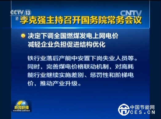 會議決定,通過疏導電價矛盾,促進減輕企業(yè)負擔、節(jié)能減排和工業(yè)結構調整。根據(jù)發(fā)電成本變化情況,從2016年1月1日起下調燃煤發(fā)電上網(wǎng)電價,全國平均每千瓦時降低約3分錢,降價金額重點用于同幅度降低一般工商業(yè)銷售電價、支持燃煤電廠超低排放改造和可再生能源發(fā)展,并設立工業(yè)企業(yè)結構調整專項資金,支持地方在淘汰煤炭、鋼鐵行業(yè)落后產能中安置下崗失業(yè)人員等。同時,完善煤電價格聯(lián)動機制,對高耗能行業(yè)繼續(xù)實施差別、懲罰性和階梯電價,推動產業(yè)升級。