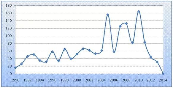 圖1揭示了全球可見光通信專利申請(qǐng)的年度趨勢(shì),從圖中可以看出,可見光通信技術(shù)的發(fā)展可以分為三個(gè)階段,從20世紀(jì)90年代開始,可見光通信技術(shù)專利開始布局,1990年的專利申請(qǐng)數(shù)量為16項(xiàng),1990-1993年,專利申請(qǐng)數(shù)量呈現(xiàn)小范圍的持續(xù)增長(zhǎng)。1994-2004年,可見光通信專利數(shù)量呈現(xiàn)波動(dòng)性變化,年專利申請(qǐng)數(shù)量維持在30-60之間。2005年之后,可見光通信技術(shù)專利申請(qǐng)數(shù)量有大幅增長(zhǎng),最高年專利申請(qǐng)數(shù)量超過100項(xiàng),但是波動(dòng)性仍然很大。