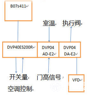 方案的具體實(shí)現(xiàn)方式為:由臺(tái)達(dá)PLC DVP04AD-E2采集各個(gè)通風(fēng)柜的門高數(shù)據(jù)(0-10V);通過臺(tái)達(dá)PLC DVP40ES200R計(jì)算出每個(gè)通風(fēng)柜的通風(fēng)量和執(zhí)行閥需要打開的角度;DVP04DA-E2輸出電壓信號(hào),控制執(zhí)行閥的角度,保證每個(gè)通風(fēng)柜的通風(fēng)量恒定,并且根據(jù)總的要求風(fēng)量,控制變頻器運(yùn)行速度。根據(jù)采集到的室內(nèi)溫度,控制空調(diào)的制熱、制冷,實(shí)現(xiàn)溫度恒定。具體的架構(gòu)如下