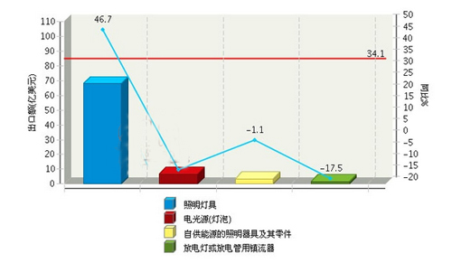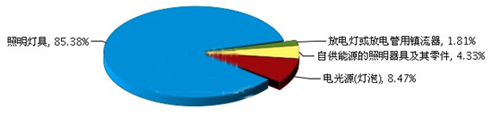 2015年1~9月,全國照明行業(yè)對美國完成累計(jì)出口額79.62億美元,同比增長34.06%。其中,照明燈具完成累計(jì)出口額67.98億美元(占85.38%),同比增長46.74%;電光源(燈泡)完成累計(jì)出口額6.75億美元(占8.47%),同比增長-13.79%;自供能源的照明器具及其零件完成累計(jì)出口額3.45億美元(占4.33%),同比增長-1.11%;放電燈或放電管用鎮(zhèn)流器完成累計(jì)出口額1.44億美元(占1.81%),同比增長-17.5%。
