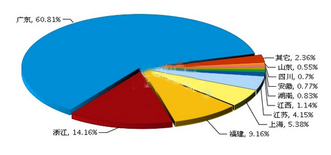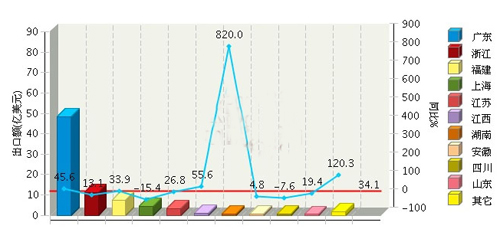 從出口地區(qū)來看,廣東、浙江、福建、上海、江蘇是出口額排在前五位的區(qū)域。其中:廣東完成累計(jì)出口額48.41億美元(占60.81%),同比增長45.6%;浙江完成累計(jì)出口額11.27億美元(占14.16%),同比增長13.14%。