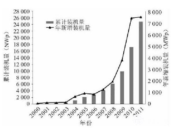 圖3 德國2000~2011年光伏年新增及累計裝機量