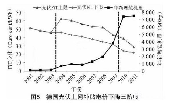 通過給予光伏系統(tǒng)安裝者在投資和回報上的雙重支持,德國主要依賴具有細(xì)化定價、長期保障且具可操作性的FiT補貼電價來刺激其光伏發(fā)電的發(fā)展。此外,德國FiT補貼電價通過衡量光伏成本以及新增裝機量的變化,分三個階段降低FiT補貼電價,在光伏發(fā)電穩(wěn)步發(fā)展的同時降低了光伏電價,平穩(wěn)了電力市場并使光伏電價更具有競爭力。