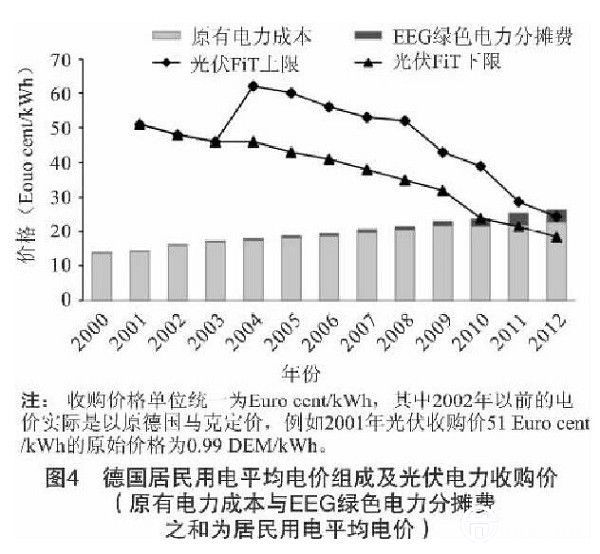 由于電力公司被強制以高價購買可再生能源發(fā)電,于是他們將這部分綠色電力費用以“EEG綠色電力分?jǐn)傎M”的形式轉(zhuǎn)嫁到電力消費者身上。雖然法定光伏上網(wǎng)電價補貼在不斷下降,但是由于裝機規(guī)模的不斷攀升,綠色電力分?jǐn)傎M也越來越高。與此同時,傳統(tǒng)能源的價格也在上升,這雙重力量導(dǎo)致德國國內(nèi)居民用電平均價格從2000年的13.9Eurocent/kWh上升到2012年的26.4Eurocent/kWh(見圖4柱狀圖)。