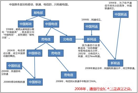 2008年奧運會年,網(wǎng)通和聯(lián)通合并,成立新聯(lián)通。移動收購鐵通,電信則從聯(lián)通手中購買CDMA。至此,通信行業(yè)算是形成三足鼎立之勢。