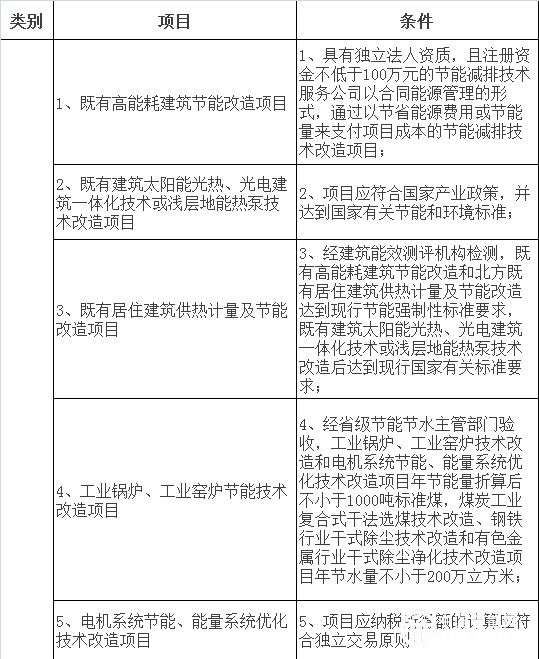 余熱余壓利用、綠色照明等節(jié)能效益分享型合同能源管理項(xiàng)目、工業(yè)鍋爐、工業(yè)窯爐節(jié)能技術(shù)改造項(xiàng)目等具有獨(dú)立法人資質(zhì),且注冊(cè)資金不低于100萬(wàn)元的節(jié)能減排技術(shù)服務(wù)公司以合同能源管理的形式,通過(guò)以節(jié)省能源費(fèi)用或節(jié)能量來(lái)支付項(xiàng)目成本的節(jié)能減排技術(shù)改造項(xiàng)目;燃煤電廠煙氣脫硫技術(shù)改造項(xiàng)需按照國(guó)家有關(guān)法律法規(guī)設(shè)立的,具有獨(dú)立法人資質(zhì),且注冊(cè)資金不低于500萬(wàn)元的專門從事脫硫服務(wù)的公司從事的符合規(guī)定的脫硫技術(shù)改造項(xiàng)目;