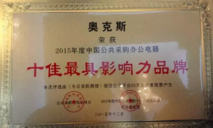 趕在2015年歲末之際,12月30日,奧克斯空調(diào)受邀出席2015-2016中國(guó)公共采購(gòu)趨勢(shì)高峰論壇,斬獲年度大獎(jiǎng)——2015年度公共采購(gòu)辦公電器十佳最具影響力品牌。