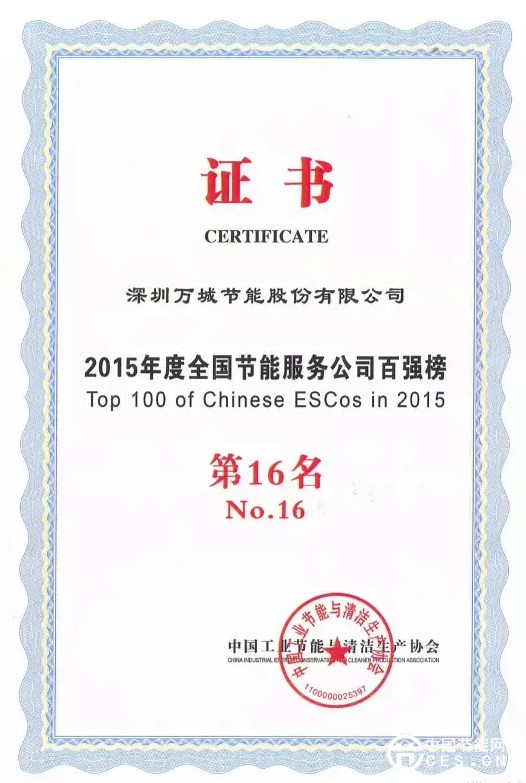 萬(wàn)城節(jié)能獲2015年度“全國(guó)節(jié)能服務(wù)公司百?gòu)?qiáng)榜”第十六名。