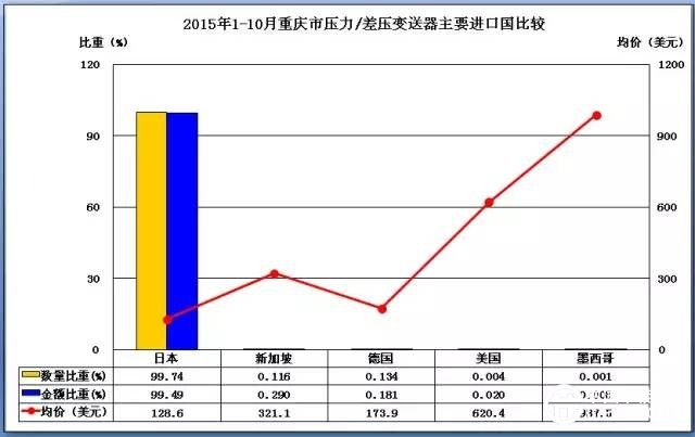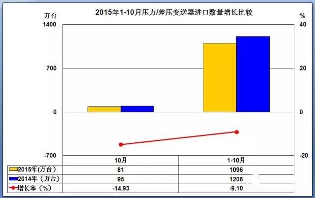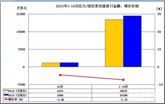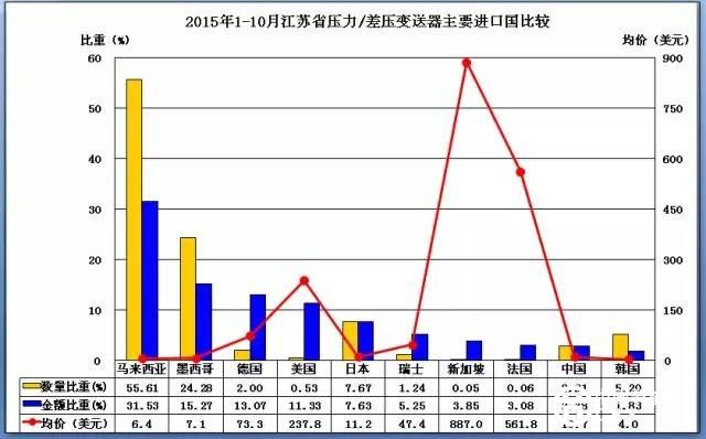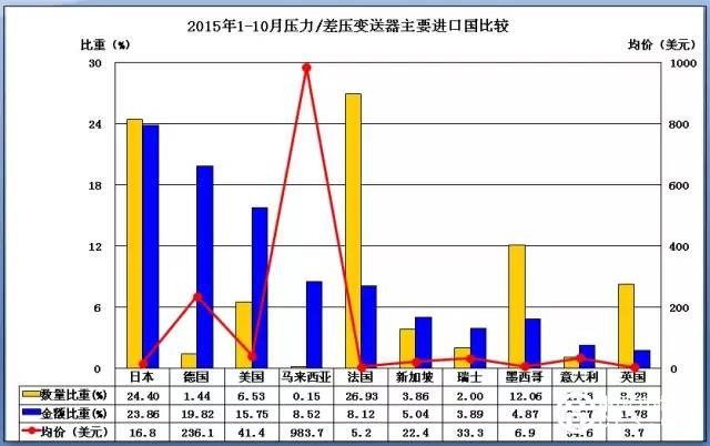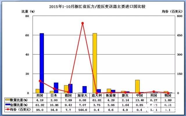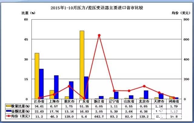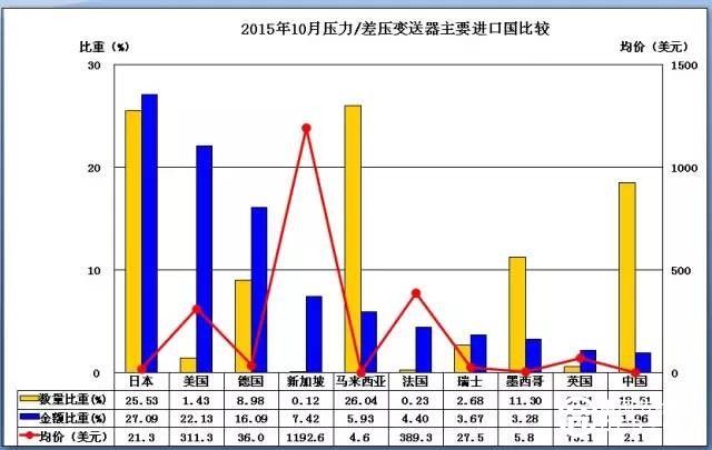 根據(jù)最新數(shù)據(jù)統(tǒng)計,2015年10月我國壓力/壓差變送器進(jìn)口807829個,進(jìn)口國家遍布29個地區(qū)??偨痤~達(dá)到16220538美元(約1.06億元人民幣),均價為20.08美元(約131元人民幣)。其中荷蘭的均價為3005.6美元(約19560元人民幣)最高(進(jìn)口16個),印度均價1230.1美元(約8000元人民幣)列第二位(進(jìn)口8個)。