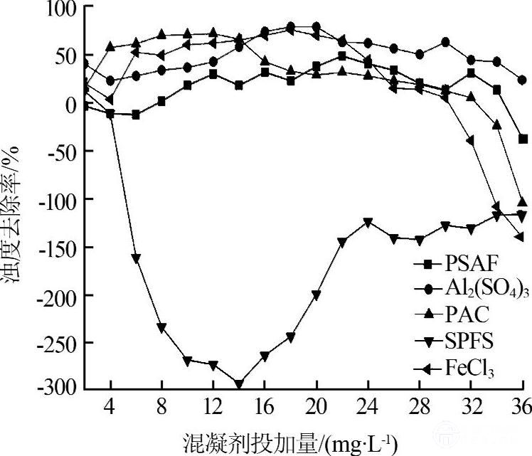 (1)PAC、Al2(SO4)3、FeCl3、PSAF對(duì)濁度去除率隨投加量的增加呈現(xiàn)先升高后趨于平穩(wěn)或降低的趨勢(shì)。鋁鹽對(duì)再生水中濁度的去除率明顯高于鐵鹽,在投加量<14 mg/L情況下PAC處理水樣濁度有明顯優(yōu)勢(shì),PAC投加量為12 mgL時(shí)濁度去除率達(dá)72.48%。