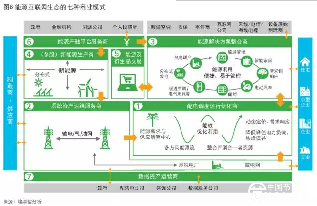 能源互聯(lián)網(wǎng)的核心價值是通過創(chuàng)新實現(xiàn)的:用戶價值創(chuàng)新、數(shù)據(jù)價值創(chuàng)新、能效價值創(chuàng)新。要實現(xiàn)這些創(chuàng)新,生態(tài)系統(tǒng)中的合作企業(yè)就需要打破傳統(tǒng)的商業(yè)模式,通過聚合用戶資源、輸配資源和技術資源,提供更多新產(chǎn)品、新服務、新贏利模式甚至投融資模式。因此,中國能源互聯(lián)網(wǎng)的生態(tài)系統(tǒng)將在這一價值框架下呈現(xiàn)雛形并開始演化(圖6)。