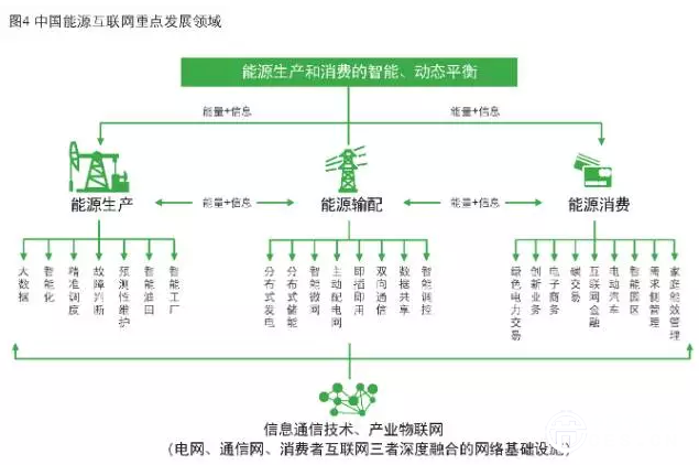 根據(jù)中國政府的“互聯(lián)網(wǎng)+智慧能源”指導意見,能源生產(chǎn)、能源輸配、能源消費領域,加之信息通信技術和物聯(lián)網(wǎng)領域,都將迎來新的投資機遇(圖4)。