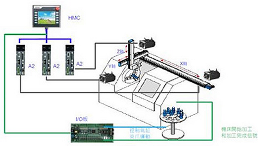在機床取出臂的控制架構中,精準的運動控制和通訊是實現(xiàn)高質量作業(yè)的關鍵。臺達提供的解決方案以內(nèi)建可編程邏輯控制器的人機控制器HMC系列為上位控制器,除原有的人機接口功能,還支持簡單的程序編輯,具備一機兩用的優(yōu)勢;X、Y、Z三軸的運動控制,則使用高精高速的伺服驅動器ASDA-A2系列搭配伺服馬達ECMA系列,定位精度達0.02mm;另選用遠程I/O通訊板支持外部訊號的輸入與輸出。方案整體架構簡單,易安裝維護,提供迅速、穩(wěn)定的取出臂動作控制。