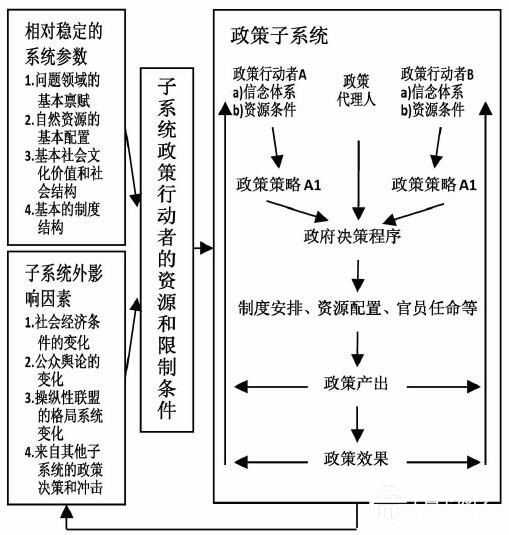 左邊的兩個方框是兩組外生變量:相對穩(wěn)定的系統(tǒng)參數(shù)和子系統(tǒng)外影響因素。系統(tǒng)參數(shù)較為穩(wěn)定,短時間內(nèi)較難改變,包括:問題領域的基本稟賦、基本的制度結構、社會文化價值和政治系統(tǒng)的資源配置情況。子系統(tǒng)外影響因素變動可能性大,是發(fā)生政策變遷的必要條件,包括:主要的社會經(jīng)濟變化、公眾輿論的變化、操縱性聯(lián)盟的格局系統(tǒng)變化以及來自其他子系統(tǒng)的政策決策和沖擊。這兩組變量會通過影響子系統(tǒng)政策行動者的資源和限制條件(中間方框)來對政策子系統(tǒng)造成影響。