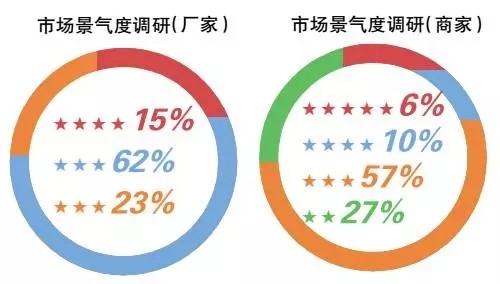 為了更深層次地了解2015年廠商的經(jīng)營實況,大照明全平臺面向全國照明廠商以“5顆星”為標(biāo)準(zhǔn),對“2015年市場景氣度”進行調(diào)研。調(diào)研結(jié)果顯示,企業(yè)方面,認(rèn)為市場景氣度值3顆星的占比為62%,2顆星的占比為23%;而認(rèn)為市場并沒有想象中的那么糟糕,值4顆星的占比為15%。商家方面,認(rèn)為市場景氣度值5顆星的占比6%,4顆星的占比10%,3顆星的占比57%,2顆星的占比為29%。從整體上來看,雖然不少廠商在抱怨生意難做、賣場蕭條、庫存壓力大、電商沖擊等,但是部分廠商依舊取得了令人欣慰的好成績。