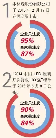 從以上我們不難看出,“木林森股份有限公司于2015年2月17日在深交所上市”的企業(yè)關(guān)注度達95%,商家關(guān)注度達87%。作為行業(yè)新秀,木林森的迅猛發(fā)展靠的不僅僅是資金實力,還有市場美譽度與品牌知名度;上市之后木林森的一舉一動,更是成為廠商關(guān)注的焦點。