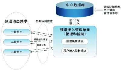 在技術上,為了實現動態(tài)頻譜管理和動態(tài)共享,需要引入共享授權頻譜接入管理單元,作為信息和控制交換的節(jié)點,記錄各頻段的注冊使用情況,裁決不同用戶在共享頻段的接入和使用。如圖所示: