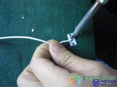 端先裝入,較長(zhǎng)的白線穿到鋁管另外一邊,電源順著放入鋁管中。