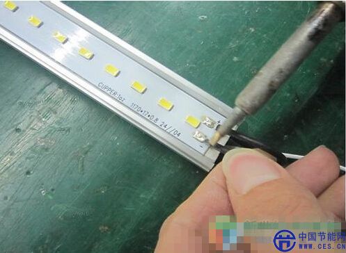 2.把電源從鋁基板上有“LED+”“LED-”的一側(cè)裝入鋁管,把白線