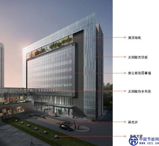 該示范樓占地約4800平方米,地上建筑面積為12000平方米,地上9層,地下2層,采用28項國際領(lǐng)先的低碳環(huán)保技術(shù),是高新低碳技術(shù)和產(chǎn)品的“博覽館”。該樓將自然光引入建筑內(nèi)部,節(jié)約建筑照明能耗,還能進行自然殺菌,凈化室內(nèi)空氣。該樓棟地面綠化、立體垂直綠化、屋頂綠化融為一體。室外廣場采用透水地面,雨水通過滲水表面進入地下水,涵養(yǎng)地下水資源降低廣場地面溫度。投用后,大樓相對節(jié)能量比國家2005年公共建筑節(jié)能標準節(jié)能30%、節(jié)碳35%。并榮獲中國綠色建筑評價標準三星獎、日本建筑物環(huán)境綜合性能評價S級,英國建筑環(huán)境評估優(yōu)秀獎以及美國能源與環(huán)境設(shè)計先鋒獎金獎。