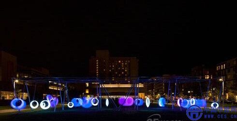 這20個秋千中內(nèi)置的LED燈源由定制的微控制器操控,可以為燈光照明提供信號。秋千內(nèi)部的加速度計可以測量其力度。當秋千處于靜止狀態(tài)時,LED燈會發(fā)出微弱的白光,當秋千被晃動時,白光就會轉(zhuǎn)換成紫色的光。這種應(yīng)激反應(yīng)式的使用方法意在鼓勵人與人、人與裝置之間形成良好互動,讓公園成為一個更和諧的社區(qū)。
