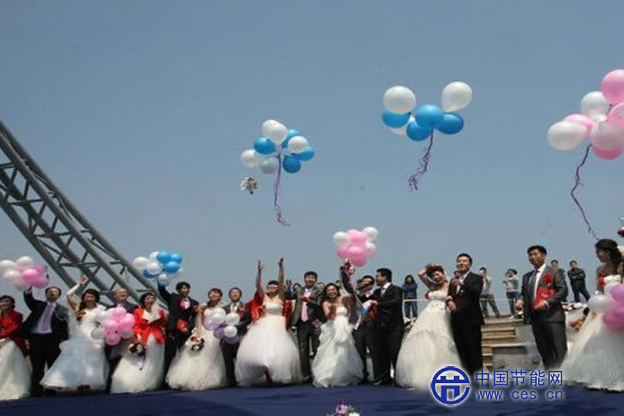 新華社照片,煙臺(山東),2013年5月1日 環(huán)保婚禮 奉獻愛心 5月1日,新人們在煙臺市經(jīng)濟技術(shù)開發(fā)區(qū)天馬棧橋放飛氣球。當(dāng)日,一場以“藍天為媒大海作證”為主題的集體婚禮在山東省煙臺市經(jīng)濟技術(shù)開發(fā)區(qū)舉行。這場時尚簡約的婚禮告別豪華鋪張的婚宴、繁瑣喧鬧的程序,在大海邊清新的自然空間,讓12對新人和親友享受自由自在的婚禮時光。新華社發(fā)(申吉忠 攝)