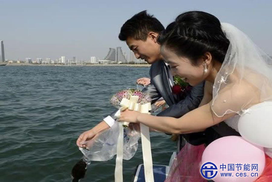 新華社照片,日照(山東),2013年5月1日 環(huán)?;槎Y 奉獻愛心5月1日,在山東省日照市萬平口外圍海域,參加集體婚禮的新人在放流魚苗。當(dāng)日,山東省日照市舉辦“海誓山盟”第十一屆青年集體婚禮。17對新人通過魚苗生態(tài)放流、自行車環(huán)保騎游、婚慶典禮、愛情林共植幸福樹四項活動,踐行移風(fēng)易俗、文明簡約、低碳環(huán)保的婚慶理念。新華社發(fā)(陳為峰 攝)