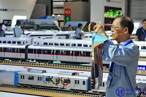 6月17日,參觀者在中國北車軌道交通解決方案展示模型前拍照。當(dāng)日,2014中國國際軌道交通展在上海新國際博覽中心開幕。