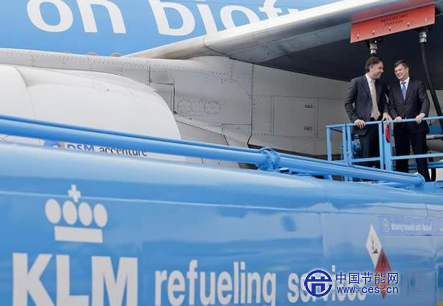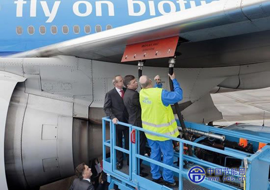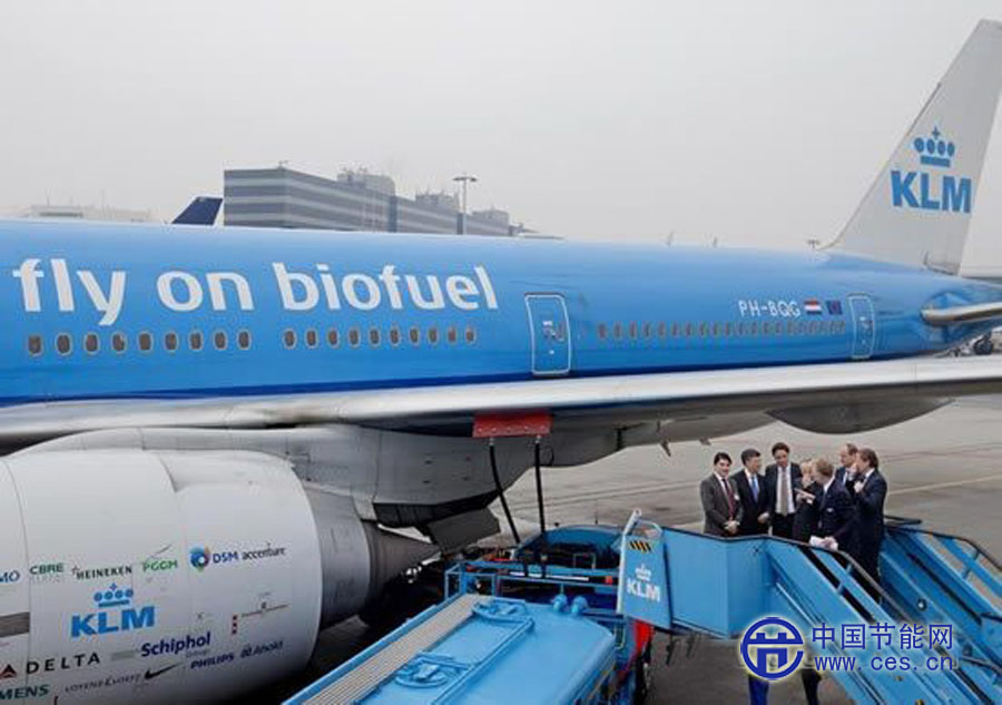3月8日,在荷蘭阿姆斯特丹,荷蘭前首相巴爾克嫩德(中)參觀即將起飛的荷蘭皇家航空公司最新生物油燃料航班。