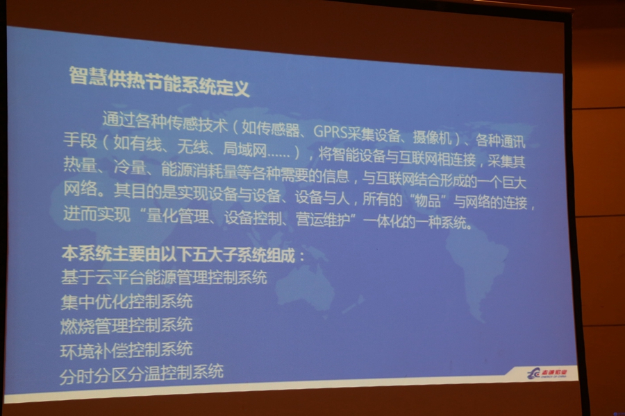 接下來我介紹的主題是,智慧供熱,綠色未來,主題分為兩個部分,第一部分是,智慧供熱節(jié)能系統(tǒng),第二,節(jié)能產品介紹。首先介紹智慧供熱節(jié)能系統(tǒng),智慧供熱節(jié)能系統(tǒng)的定義是,通過各種傳感技術如傳感器,GPRS采集設備,攝像機各種通訊手段,如有線,無線,局域網(wǎng)將智能設備與互聯(lián)網(wǎng)相連接,采集其熱量,冷量,能源消耗量等各種需要的信息,與互聯(lián)網(wǎng)結合,形成一個巨大的網(wǎng)絡,其目的是實現(xiàn)設備與設備,設備與人,所有的物品與網(wǎng)絡相連接,進而實現(xiàn)量化管理,設備控制,營運維護,一體化的一種系統(tǒng),本系統(tǒng)由一下五大子系統(tǒng)組成,基于云平臺能源管理系統(tǒng),集中優(yōu)化控制系統(tǒng),燃燒管理控制系統(tǒng),環(huán)境補償控制系統(tǒng),分時分區(qū)分溫控制系統(tǒng),請看智慧供熱節(jié)能系統(tǒng)的構架圖,此系統(tǒng)分為四層,由全面感知層,節(jié)能設備管理層,可靠傳遞層,智能預算層組成,全面感知層的傳感器采集各種信息,設備管理層的控制器根據(jù)采集信息,對下層設備進行良好的控制,并將數(shù)據(jù)打包成協(xié)議,以3D,4D因特爾等網(wǎng)絡形式傳遞到后臺的云服務器內,在云端進行處理及信息分享,用戶可以通過計算機及智能手機瀏覽各種用能信息,從而形成了智慧供熱節(jié)能系統(tǒng),下面介紹第一個子系統(tǒng),基于云平臺能源管理控制系統(tǒng)是我公司根據(jù)國家有關導則要求而研發(fā)的企業(yè)耗能,公共建筑耗能等監(jiān)測管理系統(tǒng),該系統(tǒng)具有強大的途徑化管理功能,可以根據(jù)水,電,器及其他能源介質的檢測,系統(tǒng)土布圖生成圖形化虛擬界面,實現(xiàn)高度現(xiàn)場感的管理體驗,系統(tǒng)還支持多種控制工具,多媒體管理工具,數(shù)據(jù)庫管理工具等輔助功能,可方便實現(xiàn)能耗管理系統(tǒng)的詳細記錄及能耗趨勢管理功能,基于云平臺管理控制系統(tǒng)結合現(xiàn)代通訊技術,與自動化技術,可以完成能源動力系統(tǒng)相關設備在正常及事故情況下的監(jiān)測,保護,控制,可以完全以動態(tài)圖形方式對各類能源消耗情況進行實時監(jiān)控,通過相關儀表的采集,控制與通信功能,或與其他主流tcs,plc系統(tǒng),將能源動力系統(tǒng)的各項運行參數(shù)與狀態(tài)上傳,從而及時掌握耗能設備及用能單元的能源消耗,對其進行有效監(jiān)管,以提高企業(yè)能源管理水平,和實現(xiàn)管理節(jié)能的目的,請看志誠宏業(yè)能源管理系統(tǒng)軟件的訪問界面,用戶可以通過瀏覽器直接訪問,無需進行軟件預裝,非常方便,進入軟件后,首先映入用戶眼簾的是界面一,項目的地理位置,運行時間,各種能源節(jié)約數(shù)據(jù),及累計節(jié)約資金,一目了然,非常清晰,點擊進入界面二后,用戶可以查閱項目簡介及各種能源消耗的統(tǒng)計圖表,點擊進入界面三后,軟件顯示了項目的3D圖像,當用戶用鼠標選中項目圖像時,軟件會自動顯示項目的各種監(jiān)測數(shù)據(jù),第二個子系統(tǒng),集中優(yōu)化控制系統(tǒng),集中優(yōu)化控制系統(tǒng)通過對系統(tǒng)所有檢測的參數(shù)進行實時采集,對數(shù)據(jù)進行在線存儲,處理分析輸出報表等,實現(xiàn)對設備的監(jiān)測及控制,監(jiān)測中心可計算預測供熱負荷要求,根據(jù)運營工況,對監(jiān)測系統(tǒng)進行鍋爐模糊負荷分配的優(yōu)化,分配本系統(tǒng)內所需熱量,并確定其運營方式,平衡供熱需求,滿足末端用戶對熱量的最佳需求,第三個子系統(tǒng)是燃燒管理控制系統(tǒng),燃氣鍋爐燃燒機控制管理的研發(fā)過程中,利用燃燒尾氣中的含氧量來進行燃燒過程中的控制與管理是最佳的方案,由于需要對燃料與空氣的比例進行精確的調節(jié),使用機械連桿式的調節(jié)方法是難以做到的,所以我們提出了燃燒管理節(jié)能控制技術,運用復雜的集成電路與精度更高的伺服電機進行氧氣與燃氣的比例調節(jié),他可以根據(jù)實際生產中,煙氣、氧氣的變化與波動,而對空燃比進行電子式的調節(jié),可實現(xiàn)節(jié)能率在3%以上,請看燃燒管理示意圖,根據(jù)煙氣中的含氧量,主控制器向執(zhí)行器發(fā)出指令,執(zhí)行器控制四氟電機精確調風門和燃氣閥,從而實現(xiàn)空氣與燃氣的最佳燃燒效果,今天的第二大部分,介紹本公司的節(jié)能產品,第一智能網(wǎng)關產品,智能網(wǎng)關的核心系統(tǒng)是采用因特爾芯片,他通過無線和有線手段集中一定數(shù)量的數(shù)據(jù),并通過有線和無線技術傳輸至后臺云中心,同時可以將中心計算后的反饋控制數(shù)據(jù)通過有線和無線技術發(fā)送至終端控制設備,是智能網(wǎng)的關鍵設備,本產品符合因特爾智能系統(tǒng)框架ISF,并被因特爾指定為ISF的重要部分在全球進行推廣,主要功能特性之一,廣泛的傳統(tǒng)通信網(wǎng)絡接入能力,支持中國電信,移動,聯(lián)通三大運營商的通信網(wǎng)絡,并且可以同時支持三大網(wǎng)絡的通信,該產品除了可以支持千兆網(wǎng)口和WiFi外,另外可以支持3D,4D,2.5D,2D通信,在通信通道數(shù)量上可以進行選擇和配置,該網(wǎng)關還支持北斗通信系統(tǒng),可以實現(xiàn)三大網(wǎng)絡沒有覆蓋地點的數(shù)據(jù)通信,同時本產品還具備以下特性,智能控制能