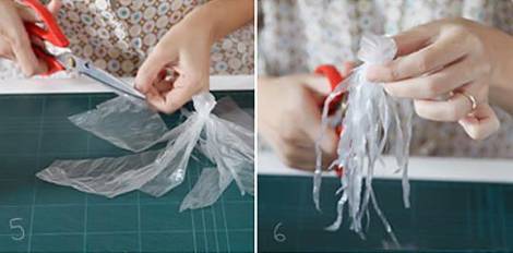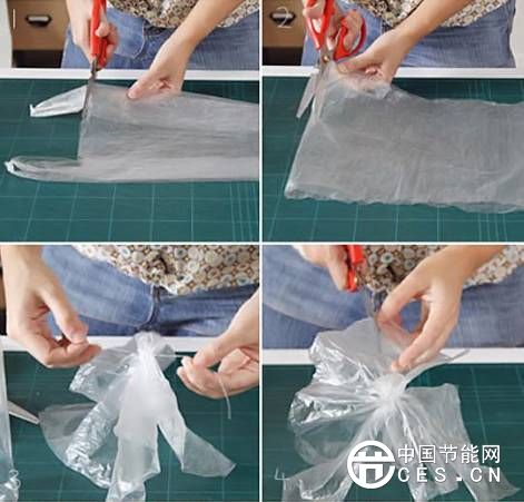 將塑料袋的提手部分減掉,留下長方形的部分,擠出一個小圓球,用繩子從中間扎緊
