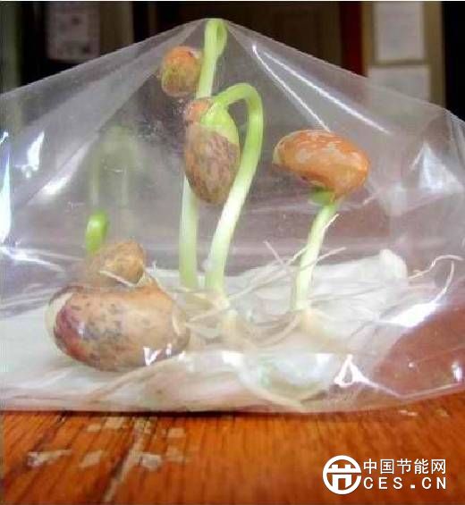 將衛(wèi)生紙浸滿水,和豆子一起放入塑料袋中,七天后就發(fā)出豆芽咯~