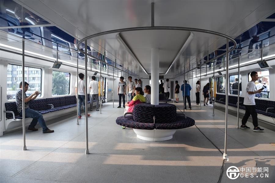 4.車廂內(nèi)有55個(gè)座位,乘客區(qū)設(shè)有20根豎立扶手,滿足高峰時(shí)段不同身高站立乘客的需求。同時(shí),車體配備多個(gè)液晶電視屏幕,方便各個(gè)角度的乘客觀看。此外,還安裝了4個(gè)動(dòng)態(tài)地圖,便于乘客查看整個(gè)城市的交通狀況。圖為8月2日,體驗(yàn)者在巴鐵1號(hào)試驗(yàn)車車廂內(nèi)部參觀。