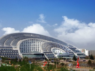 山東德州有座世界最大太陽能辦公大廈,全球首創(chuàng)性地實現(xiàn)了太陽能熱水供應(yīng)、采暖、制冷、光伏并網(wǎng)發(fā)電等技術(shù)。能把春夏秋的熱量儲存到冬季用,把冬季的冷水儲存到夏季制冷用,整體節(jié)能達(dá)到88%。圖為世界最大太陽能辦公大廈外觀。