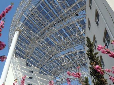 門窗、天窗和幕墻,采用了溫屏節(jié)能玻璃和BIPV溫屏光伏組件,傳熱系數(shù)降低為國家節(jié)能標(biāo)準(zhǔn)的一半,而且隔熱、隔音、防結(jié)霜露。圖為大夏外觀。