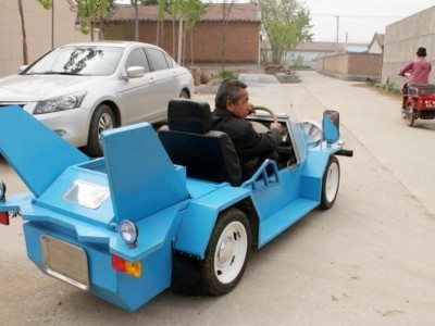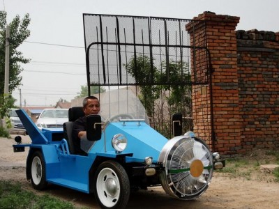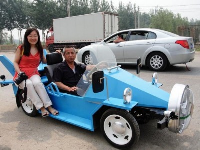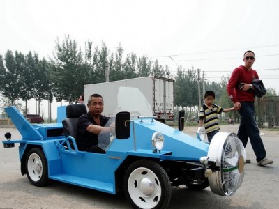 2012年5月19日,北京市通州永樂(lè)店鎮(zhèn)半截河農(nóng)民唐振平正在鄉(xiāng)村道路上試跑自制的外形酷似法拉利賽車(chē)又頗具環(huán)保意識(shí)的“敞篷”風(fēng)電跑車(chē),一美女記者坐上“敞篷跑車(chē)”,親自體驗(yàn)下這拉風(fēng)的感覺(jué),引發(fā)眾人好奇的目光。
