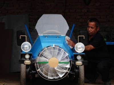 唐振平在這輛“風(fēng)電跑車(chē)”車(chē)頭安裝一個(gè)電風(fēng)扇,行駛中電風(fēng)扇風(fēng)葉旋轉(zhuǎn)發(fā)電,向車(chē)內(nèi)的蓄電池充電,能源循環(huán)利用,車(chē)內(nèi)電瓶三天充一次電就行了。