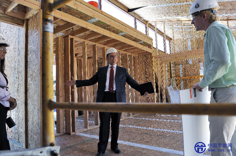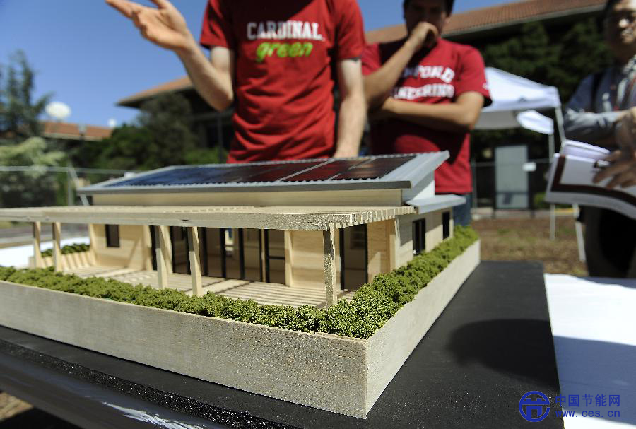 由斯坦福工程學(xué)院學(xué)生設(shè)計、50名學(xué)生從2013年3月底開始建造的這座太陽能獨戶住房以木質(zhì)為主體,面積大約92平方米,有兩個臥室、一個衛(wèi)生間,造 價約25萬美元。這座太陽能住房以零凈耗能、造價相對低廉為特色,核心是一個標(biāo)準(zhǔn)化中央控制組件,用于調(diào)適所有管道、煤氣和水電供應(yīng)以及供暖和制冷。它將 與美國、加拿大、捷克和奧地利的另外19個大學(xué)生小組設(shè)計和建造的住房一起參加美國聯(lián)邦政府能源部主辦的國際太陽能10項全能賽。新華社發(fā)(陳鋼攝)