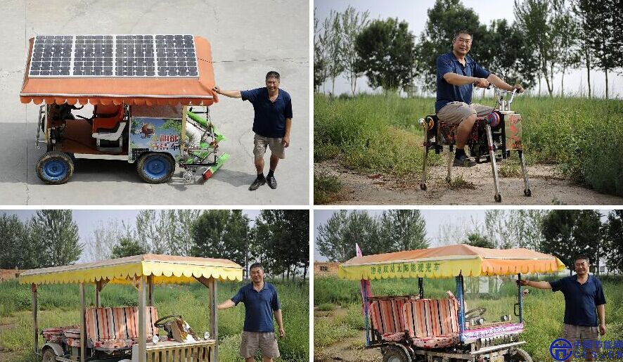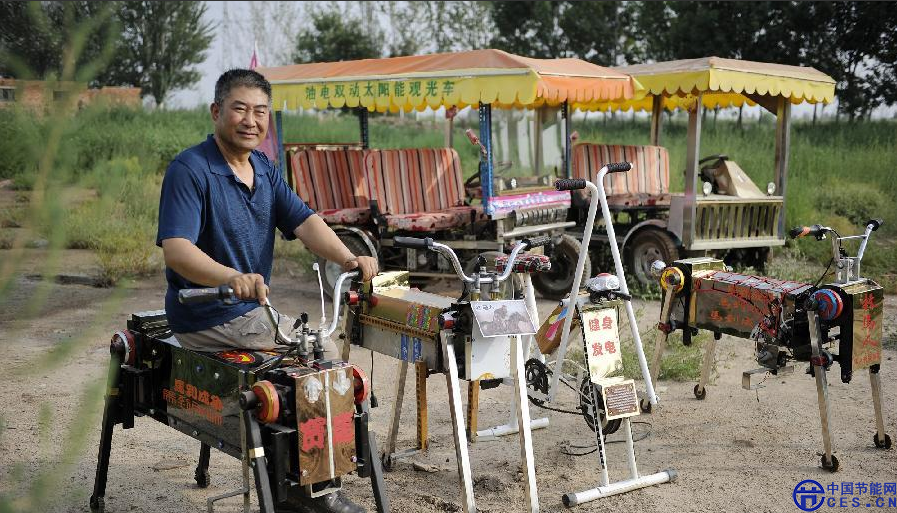 近年來,在看到新能源不斷發(fā)展,綠色環(huán)保理念廣泛推廣之后,老丁又與時俱進地開始研究與節(jié)能相關(guān)的農(nóng)機具。老丁在摸索之中時有碰壁,他說,“發(fā)明創(chuàng)造綠色環(huán)保機械,對于我這樣單槍匹馬的農(nóng)民來說,就像在亂石崗上開出一條平坦的路,困難重重”。但經(jīng)過不斷地研究、改進,老丁發(fā)明出太陽能光伏自動清掃車、油電雙動力太陽能觀光車、健身發(fā)電單車等一系列環(huán)保節(jié)能的新作品。