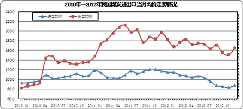 由于國際煤價低于國內(nèi),同時考慮到我國相關(guān)稅率政策的調(diào)控,2012年我國煤炭出口量持續(xù)保持低位。全年只有1、2、5三個月煤炭當(dāng)月出口量超過100萬噸,出口量最少的10月份僅有44萬噸。全年煤炭出口總量不足1000萬噸,僅有926萬噸,較去年同期減少539.2萬噸,下降36.8%。12月份當(dāng)月出口均價為165.7美元/噸,比去年同期下降31美元/噸,比1月份下降了16.6美元/噸,比上月增長14.5美元/噸;當(dāng)月出口金額僅為13585萬美元,同比下降13.6%。全年累計出口金額由去年的27.16億美元降至15.86億美元,下降41.6%,累計出口均價為173.3美元/噸,同比下降14美元/噸。我國煤炭全年實現(xiàn)凈進(jìn)口27925噸,同比增加11151萬噸,增長高達(dá)66.5%。