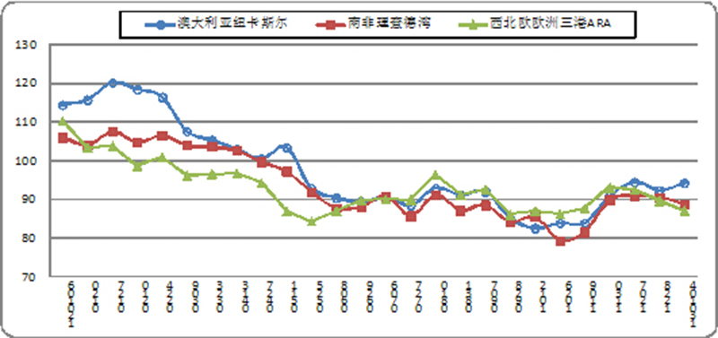 國際方面,三大港動力煤價格指數(shù)全年也基本處在下行通道當(dāng)中,截止到12月28日,紐卡斯?fàn)柛壑笖?shù)為92.25美元/噸,比年內(nèi)最高點(diǎn)時1月末的120.03美元/噸下跌了27.8美元/噸,跌幅23.2%,年內(nèi)最低價位出現(xiàn)在10中旬為82.5美元/噸;南非理查德港指數(shù)年末報收于90.5美元/噸,比1月末高位時的107.49美元/噸下跌了16.9美元,跌幅為16.2%,年內(nèi)最低價位為10月末的79.3美元/噸;歐洲三港ARA指數(shù)年末為89.5美元/噸,比一月末的103.75美元/噸下跌了14.25美元/噸,下跌13.7%,年內(nèi)價格最低時為86.17美元/噸。
